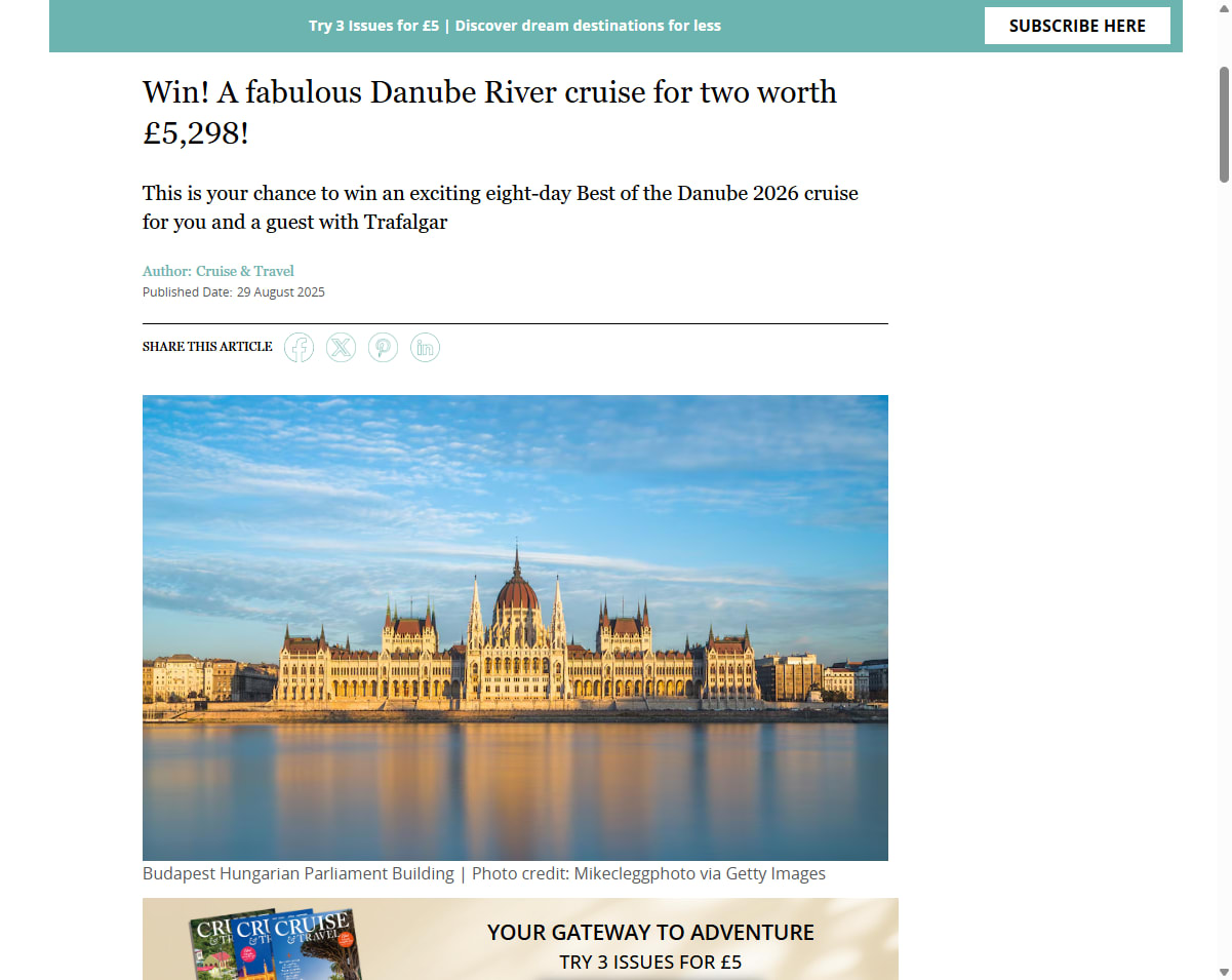 We’ve teamed up with leading holiday company Trafalgar to offer our winner the chance to enjoy this special cruise on a date of their choice, between 18 April and 17 October 2026.