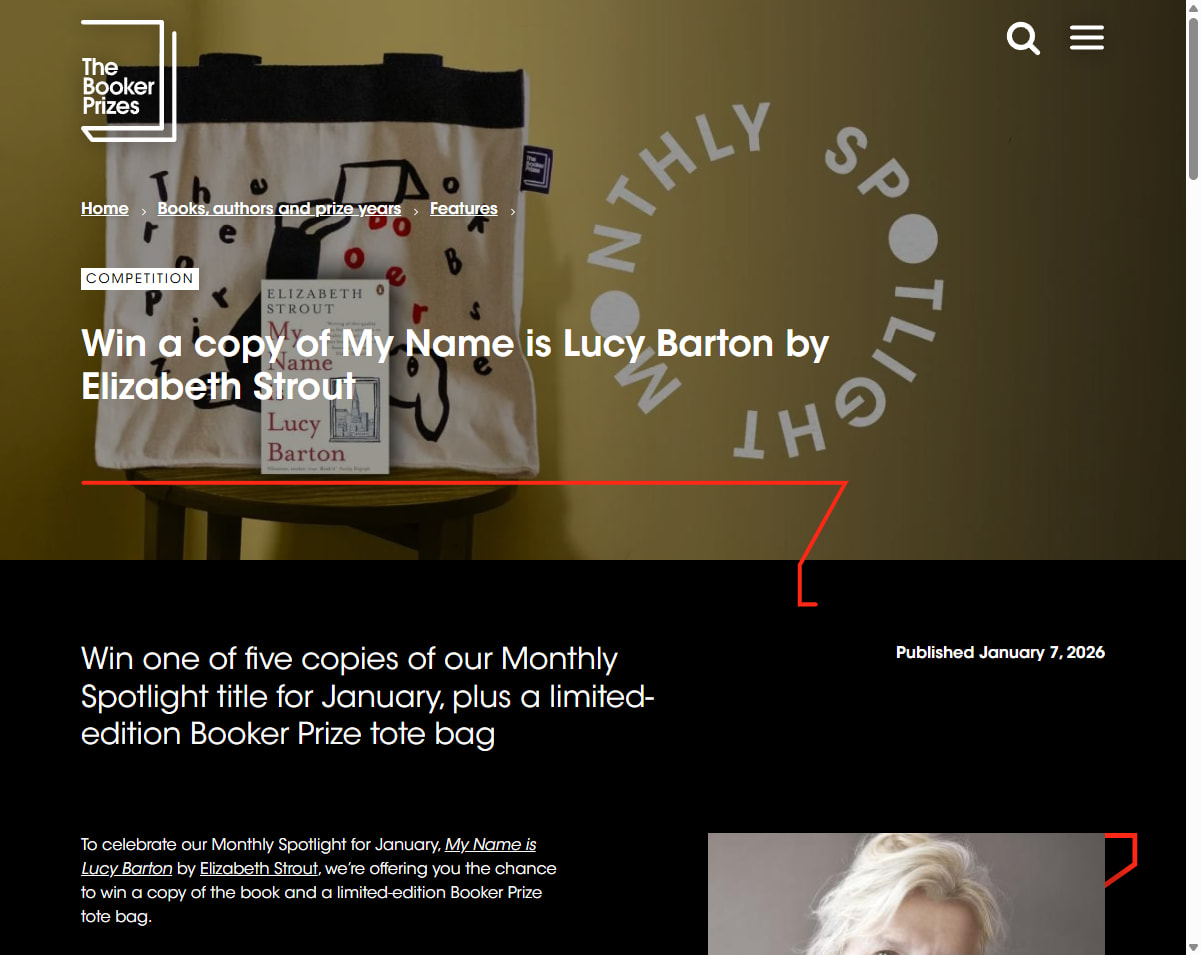 To celebrate our Monthly Spotlight for January, My Name is Lucy Barton by Elizabeth Strout, we’re offering you the chance to win a copy of the book and a limited-edition Booker Prize tote bag.