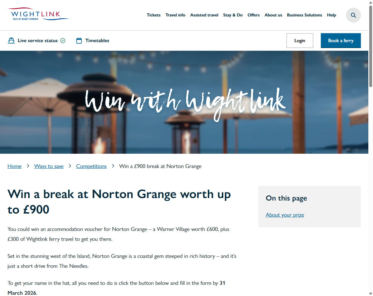 You could win an accommodation voucher for Norton Grange – a Warner Village worth £600, plus £300 of Wightlink ferry travel to get you there.