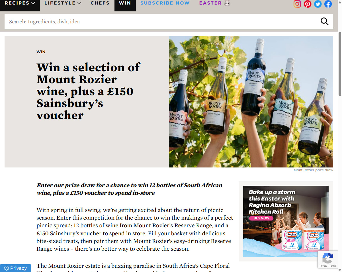 With spring in full swing, we’re getting excited about the return of picnic season. Enter this competition for the chance to win the makings of a perfect picnic spread: 12 bottles of wine from Mount Rozier’s Reserve Range, and a £150 Sainsbury’s voucher to spend in store.