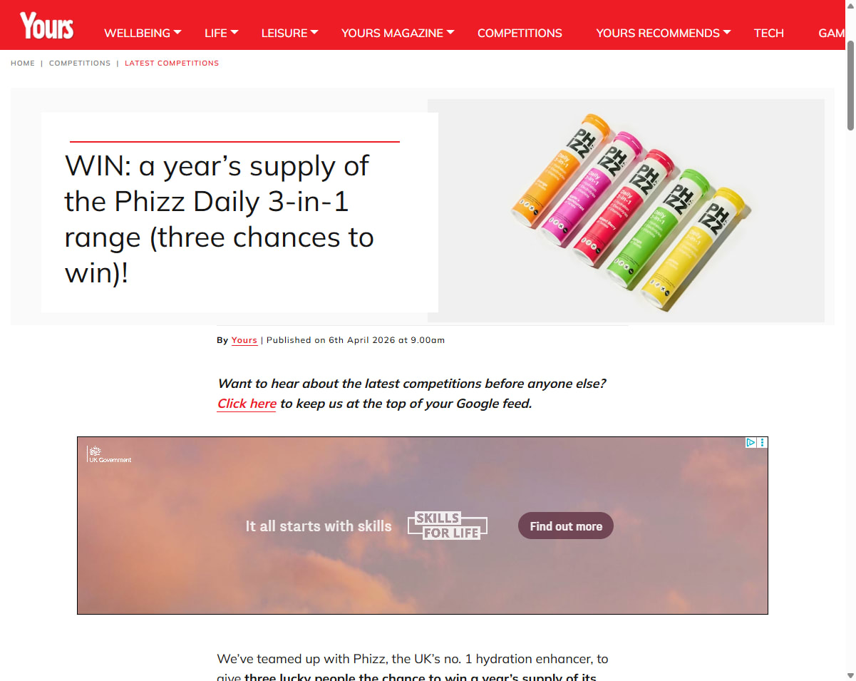 We’ve teamed up with Phizz, the UK’s no. 1 hydration enhancer, to give three lucky people the chance to win a year’s supply of its award-winning 3-in-1 range. An all-in-one solution for everyday life, this comprehensive hydration formula helps hydrate three times faster than water alone, plus it features seven key electrolytes and 18 essential vitamins to support your overall health.
