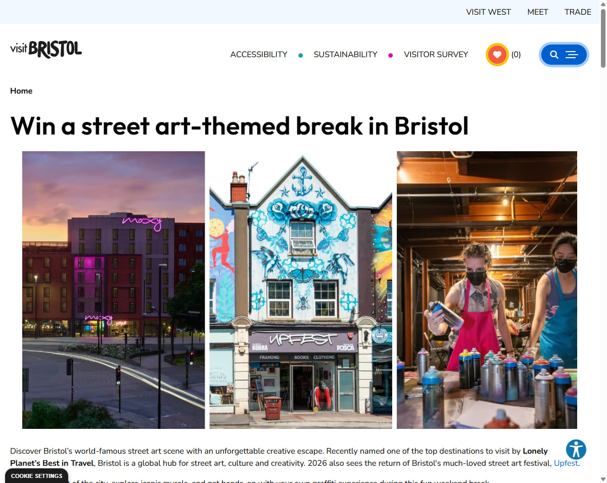 Discover Bristol’s world-famous street art scene with an unforgettable creative escape. Recently named one of the top destinations to visit by Lonely Planet’s Best in Travel, Bristol is a global hub for street art, culture and creativity. 2026 also sees the return of Bristol's much-loved street art festival, Upfest.