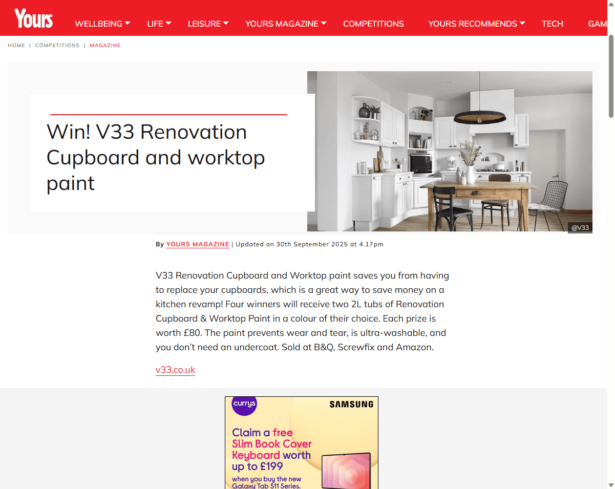 V33 Renovation Cupboard and Worktop paint saves you from having to replace your cupboards, which is a great way to save money on a kitchen revamp! Four winners will receive two 2L tubs of Renovation Cupboard & Worktop Paint in a colour of their choice. Each prize is worth £80. The paint prevents wear and tear, is ultra-washable, and you don’t need an undercoat. Sold at B&Q, Screwfix and Amazon.