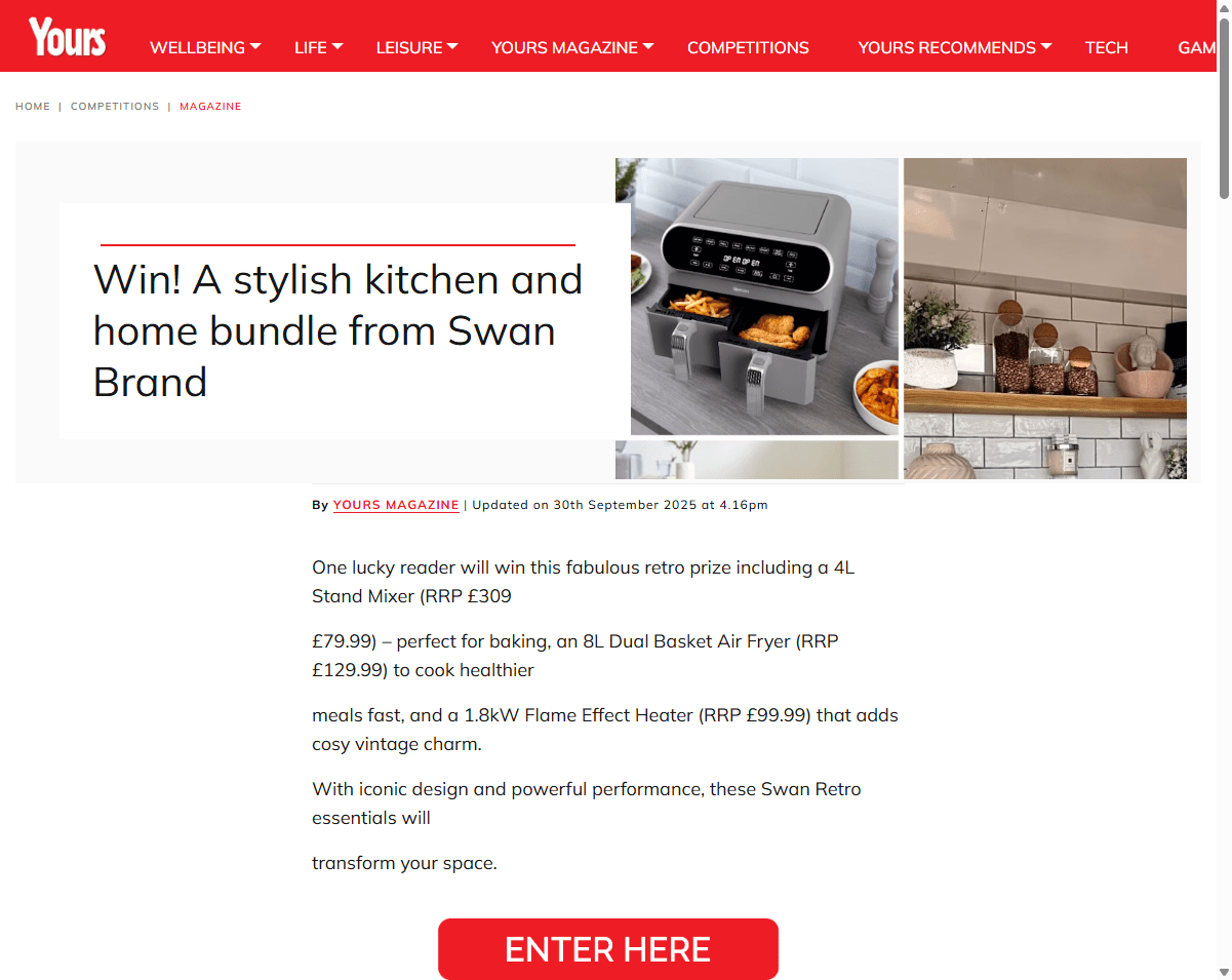 One lucky reader will win this fabulous retro prize including a 4L Stand Mixer (RRP £309 £79.99) – perfect for baking, an 8L Dual Basket Air Fryer (RRP £129.99) to cook healthier meals fast, and a 1.8kW Flame Effect Heater (RRP £99.99) that adds cosy vintage charm.