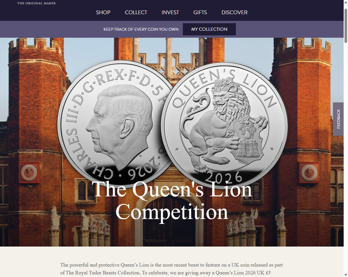 The powerful and protective Queen’s Lion is the most recent beast to feature on a UK coin released as part of The Royal Tudor Beasts Collection. To celebrate, we are giving away a Queen’s Lion 2026 UK £5 Brilliant Uncirculated Coin and a copy of the official guidebook for Hampton Court Palace to one lucky person.