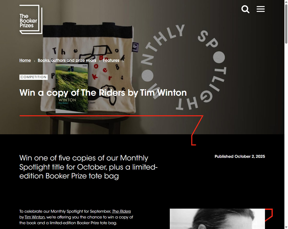 To celebrate our Monthly Spotlight for September, The Riders by Tim Winton, we’re offering you the chance to win a copy of the book and a limited-edition Booker Prize tote bag.