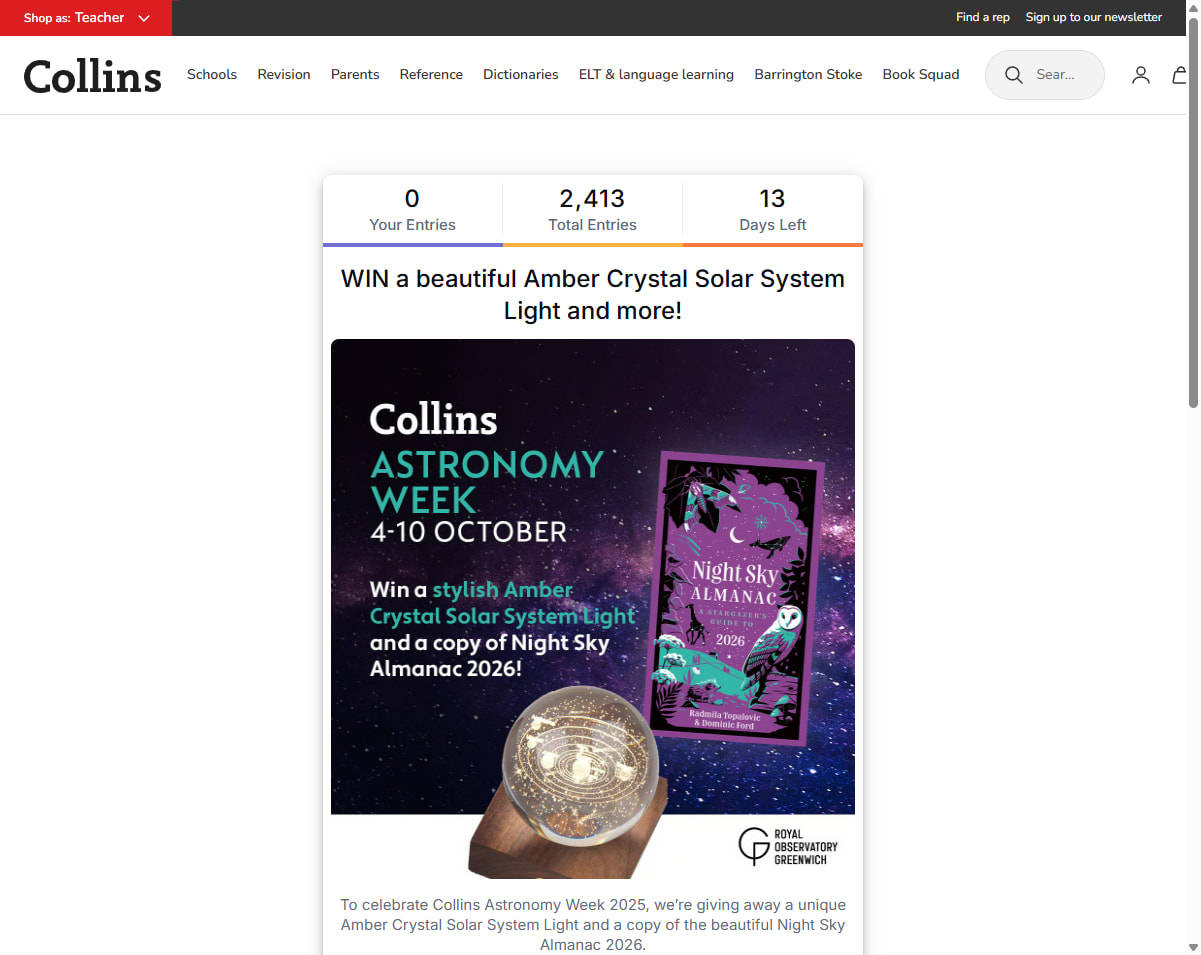To celebrate Collins Astronomy Week 2025, we’re giving away a unique Amber Crystal Solar System Light and a copy of the beautiful Night Sky Almanac 2026.