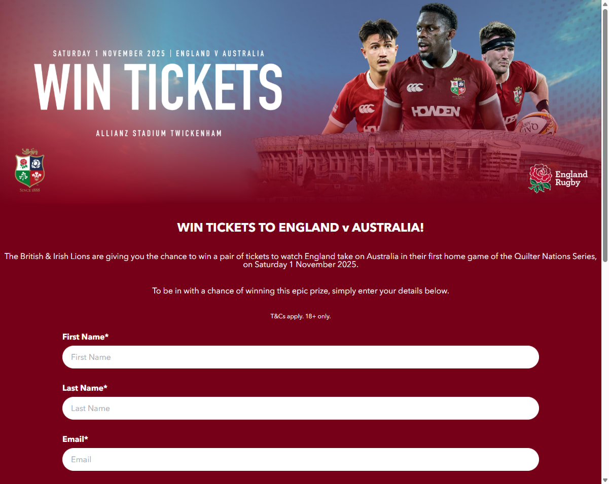 The British & Irish Lions are giving you the chance to win a pair of tickets to watch England take on Australia in their first home game of the Quilter Nations Series, on Saturday 1 November 2025.