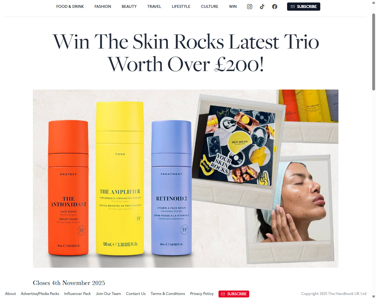 We’re giving one lucky reader the chance to get their hands on an exciting PR mailer, featuring powerhouse Skin Rocks trio. This will include their latest innovation, The Amplifier, a performance-enhancing essence, alongside super serums The Antioxidant and Retinoid 2 – so your morning and evening skincare routines will thank you.