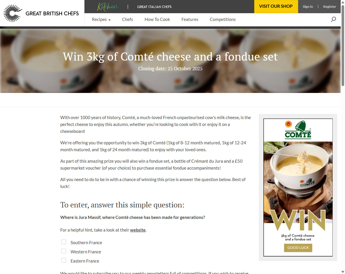 We're offering you the opportunity to win 3kg of Comté (1kg of 8-12 month matured, 1kg of 12-24 month matured, and 1kg of 24 month matured) to enjoy with your loved ones.