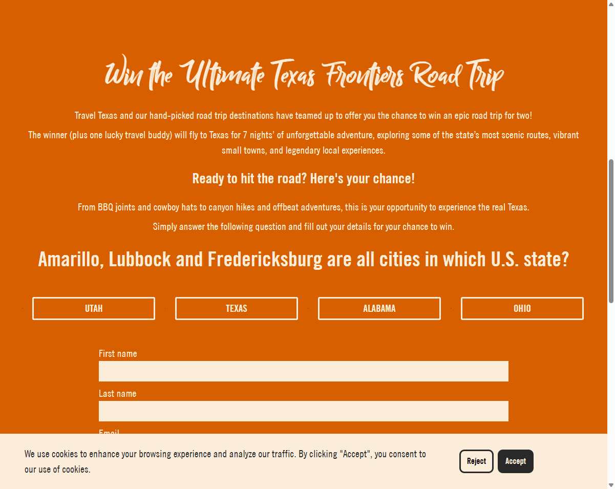 The winner (plus one lucky travel buddy) will fly to Texas for 7 nights’ of unforgettable adventure, exploring some of the state’s most scenic routes, vibrant small towns, and legendary local experiences.