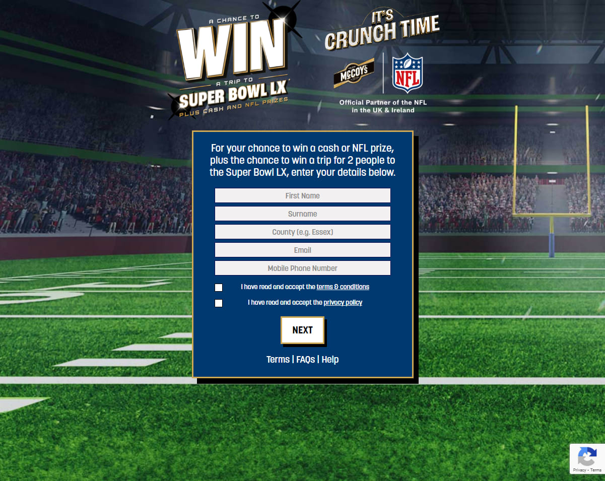For your chance to win a cash or NFL prize, plus the chance to win a trip for 2 people to the Super Bowl LX, enter your details below.