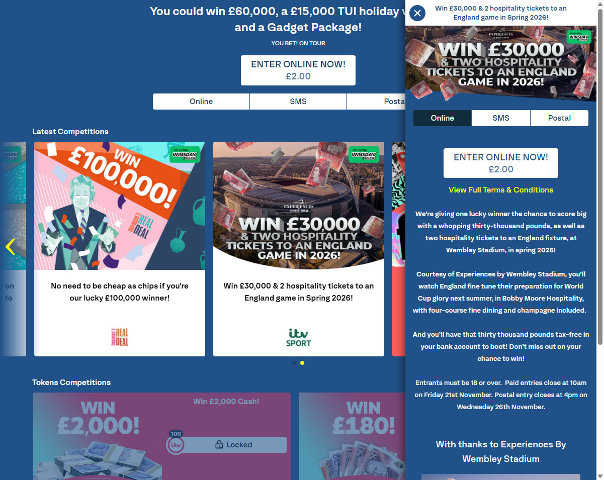 We’re giving one lucky winner the chance to score big with a whopping thirty-thousand pounds, as well as two hospitality tickets to an England fixture, at Wembley Stadium, in spring 2026!